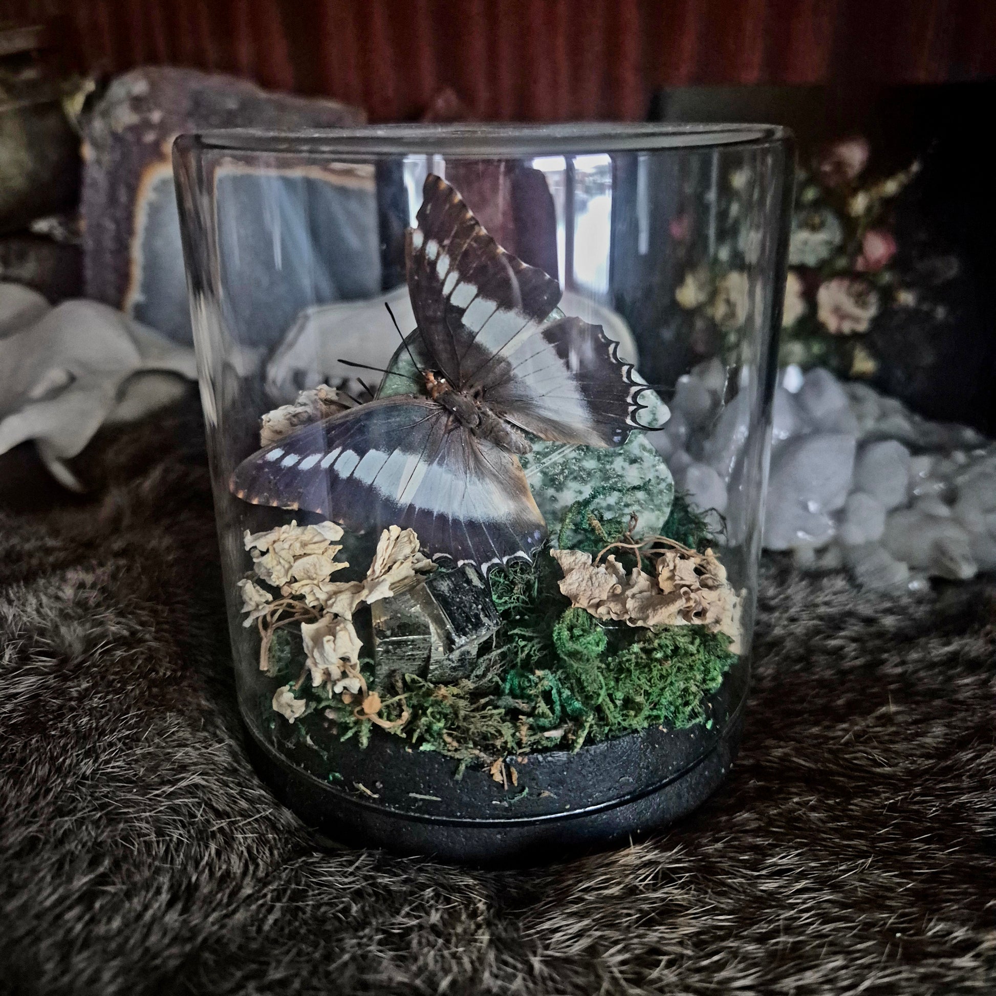 - containing charaxes brutus, tree agate leaf, pyrite, dried moss and dried florals