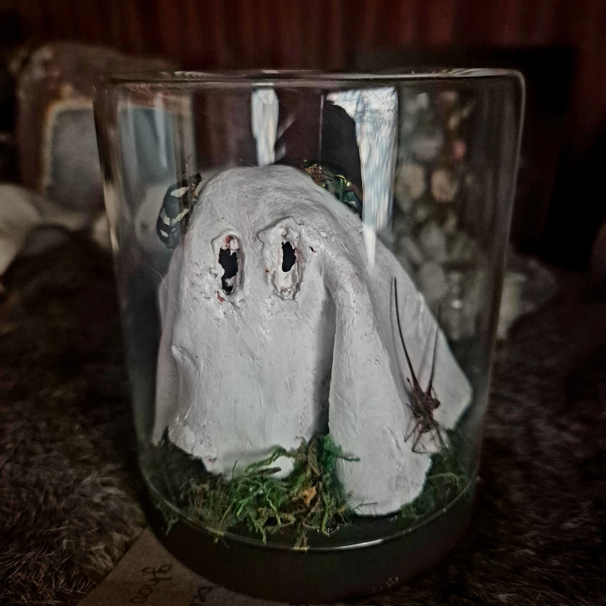 - containing handmade clay ghost, horned orb spider, white spotter chafer, green fig beetle, dried moss
