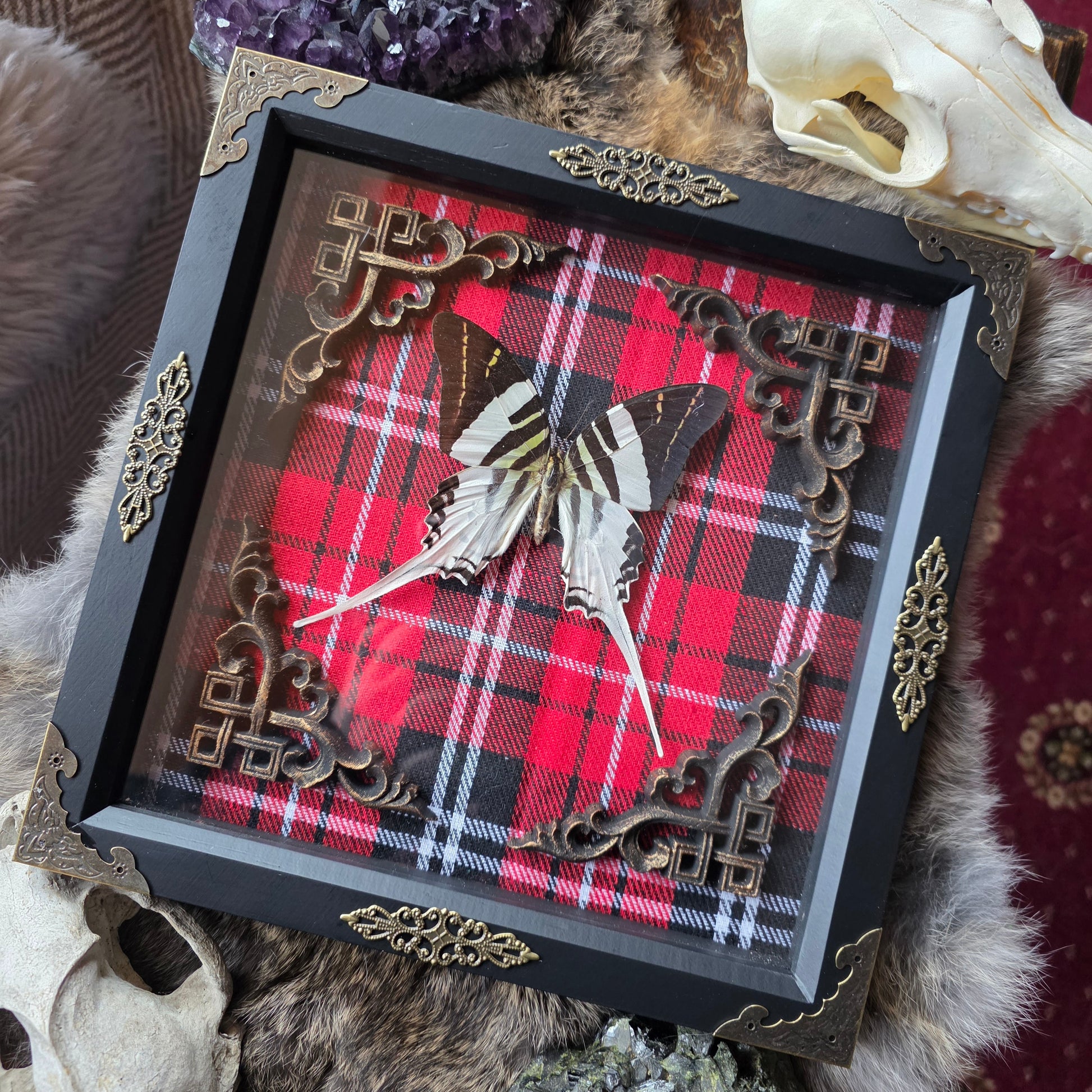 Deep box black frame decorated with metal embelishments. Containing a Giant Swordtail butterfly