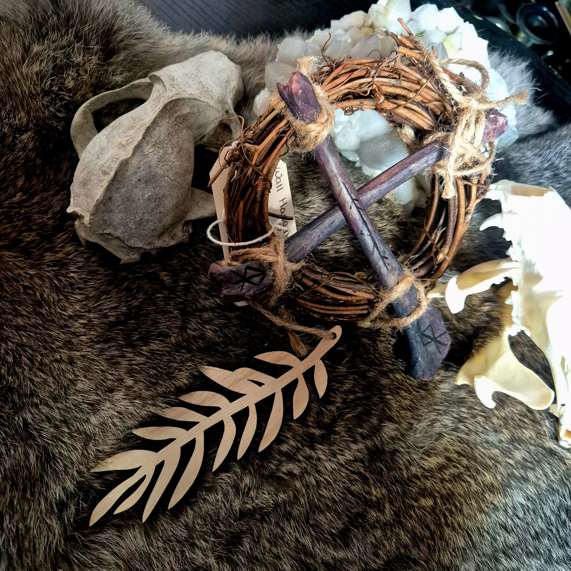 - wooden wreath, dyed bones, wooden leaves