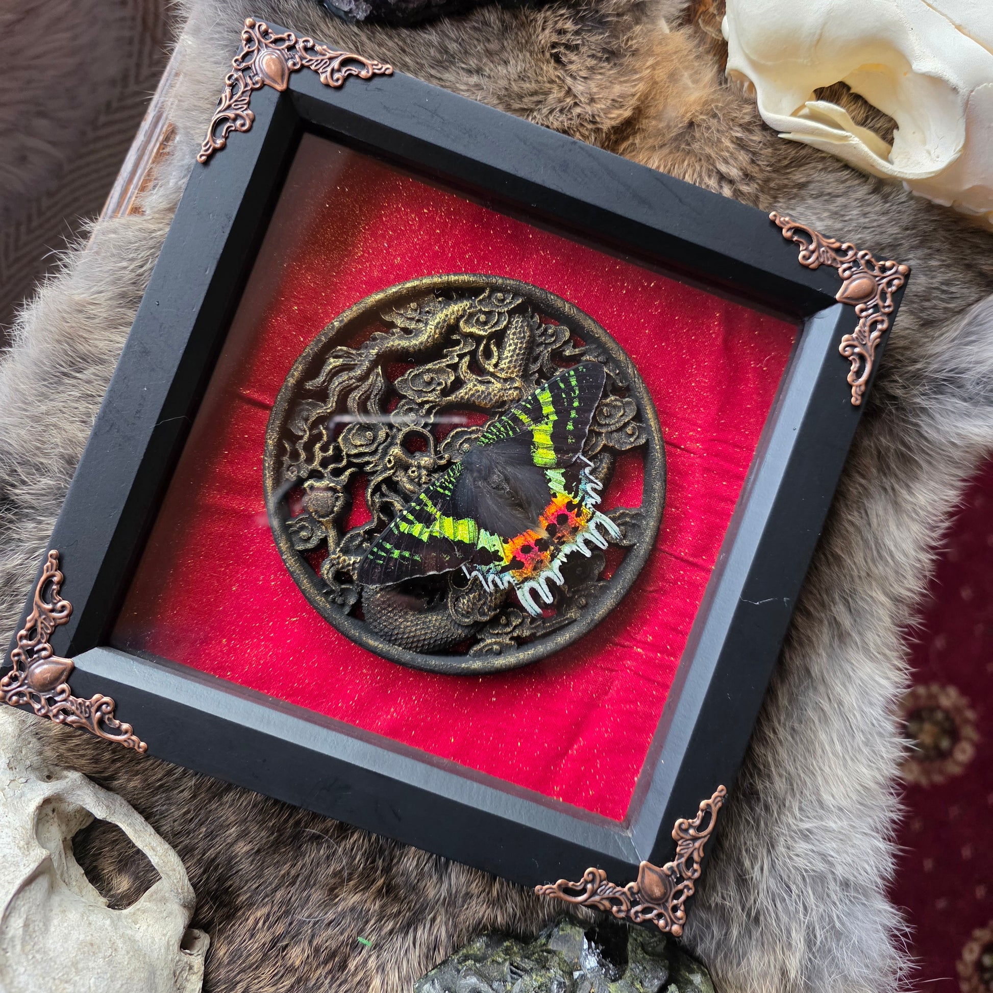 Deep box black frame decorated with metal embelishments. Containing a madagascan sunset moth