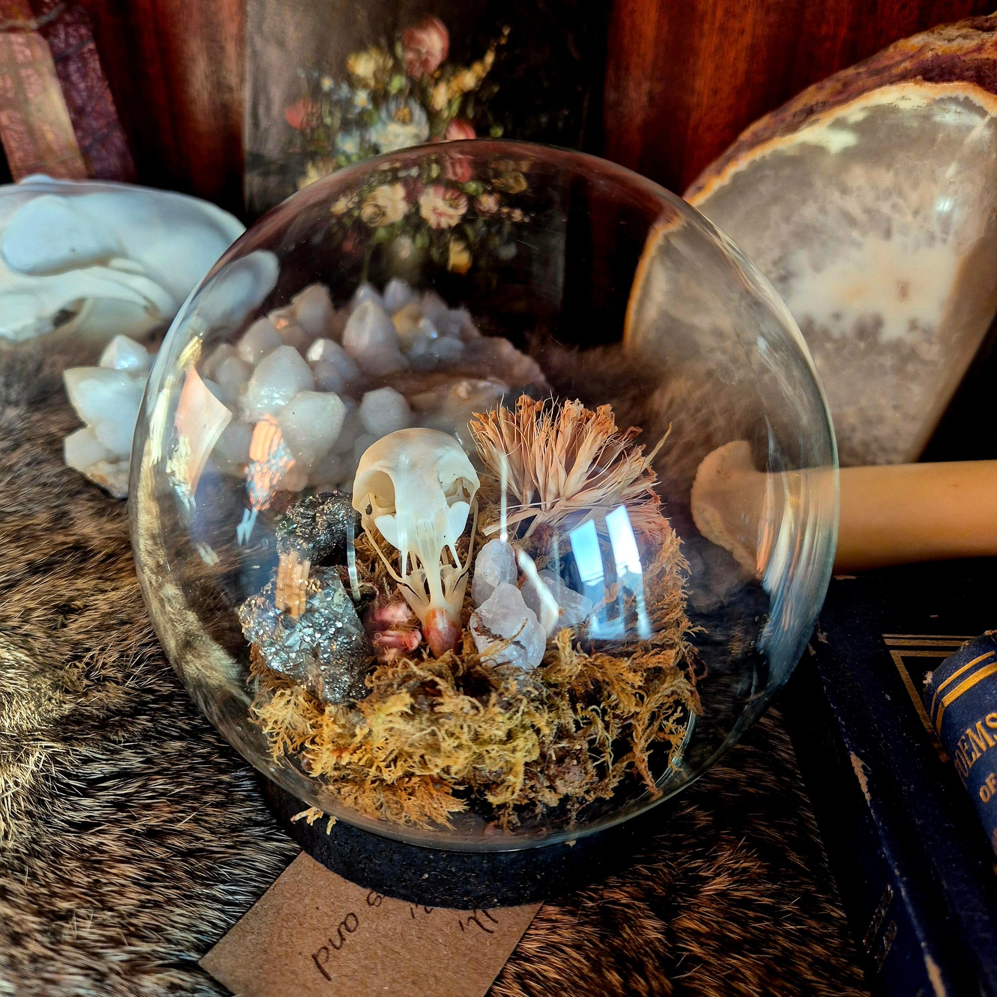 - containing partridge skull, pyrite, rose quartz, dried moss and florals