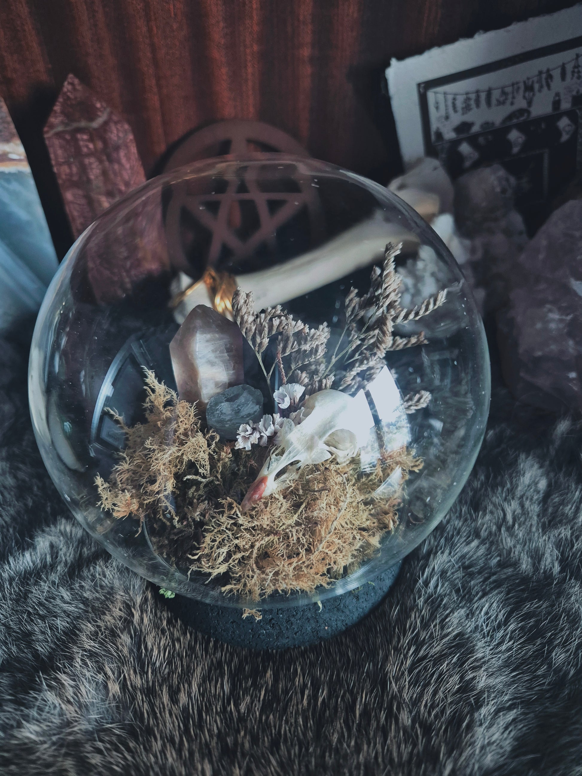 Partridge skull presented in glass bubble dome. Displayed with with florite, florite tower, moon stone tower, dried moss and dried florals
