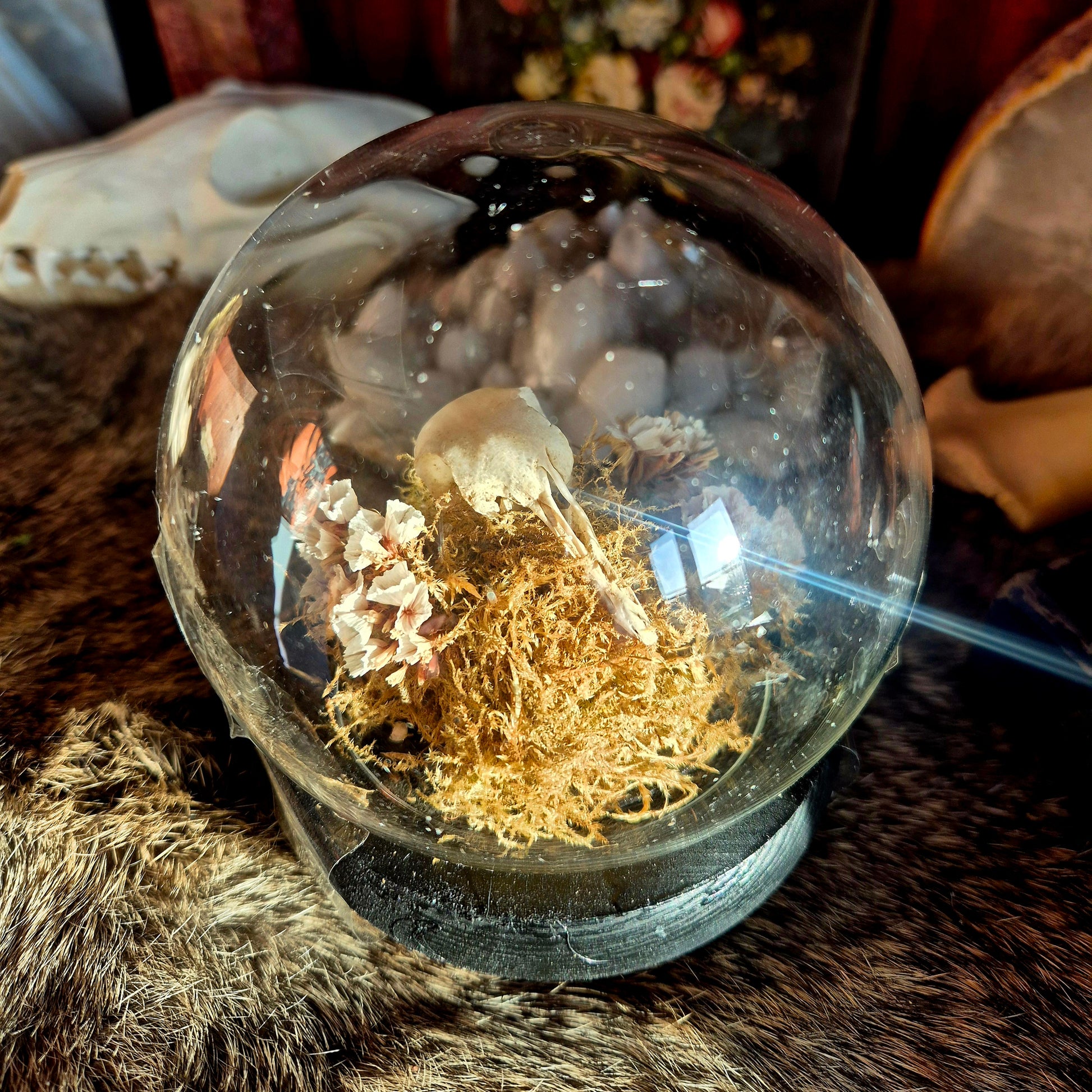 - containing pigeon skull, dried moss and dried florals