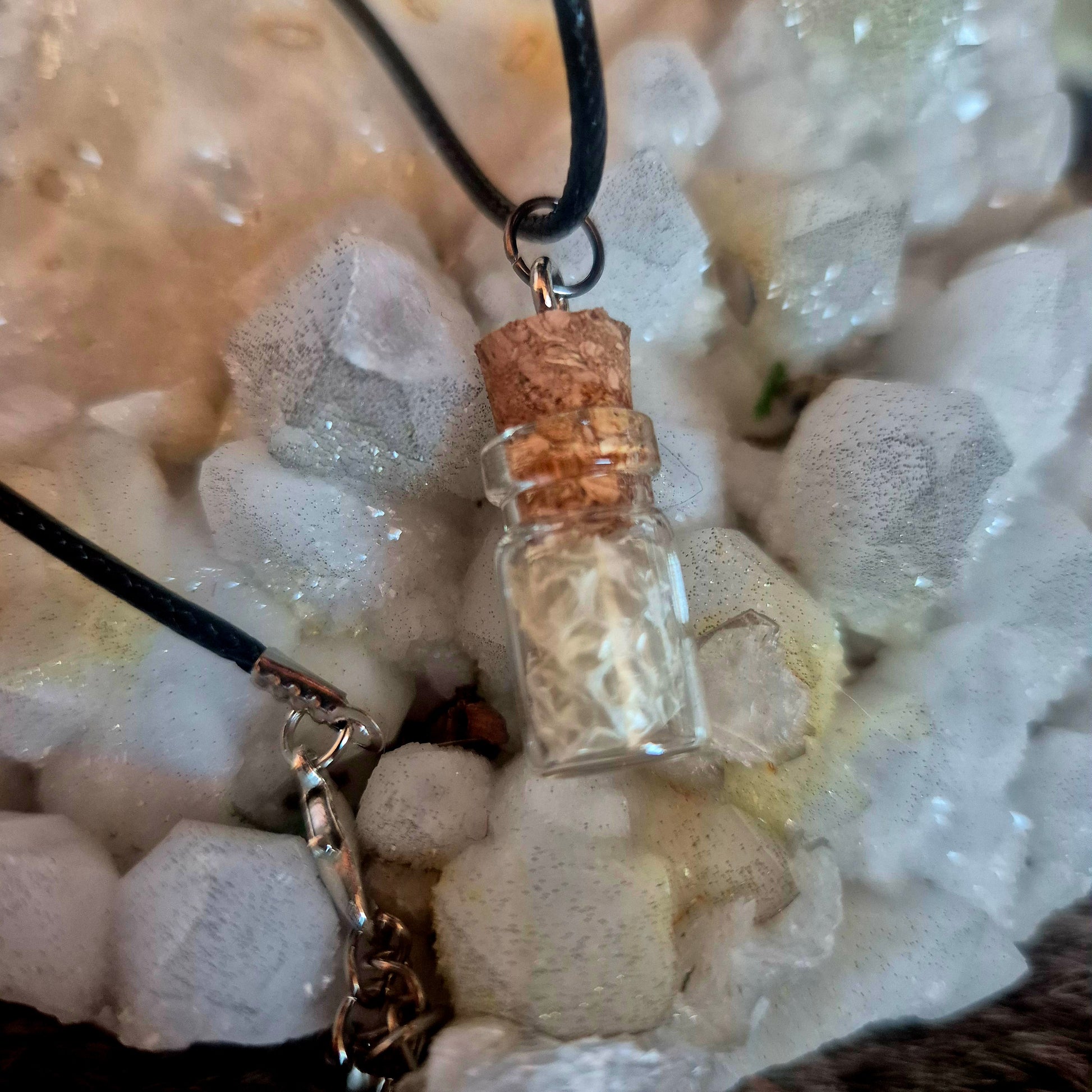 - glass bottle on faux leather cord
