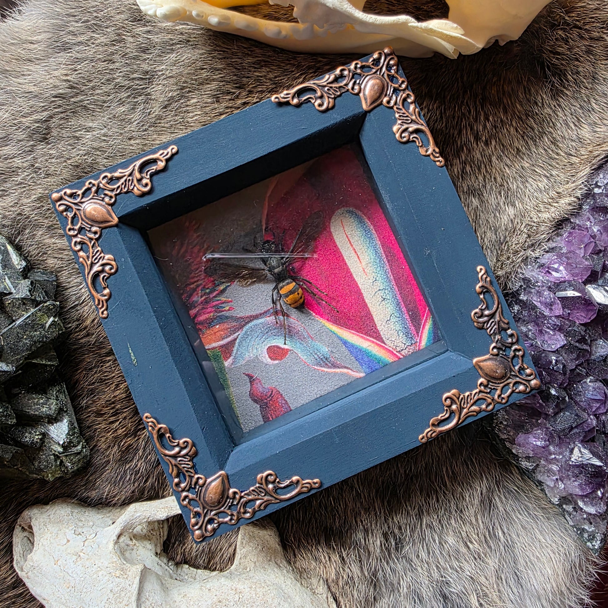 Deep box blue/grey frame decorated with metal embelishments. Containing a wasp